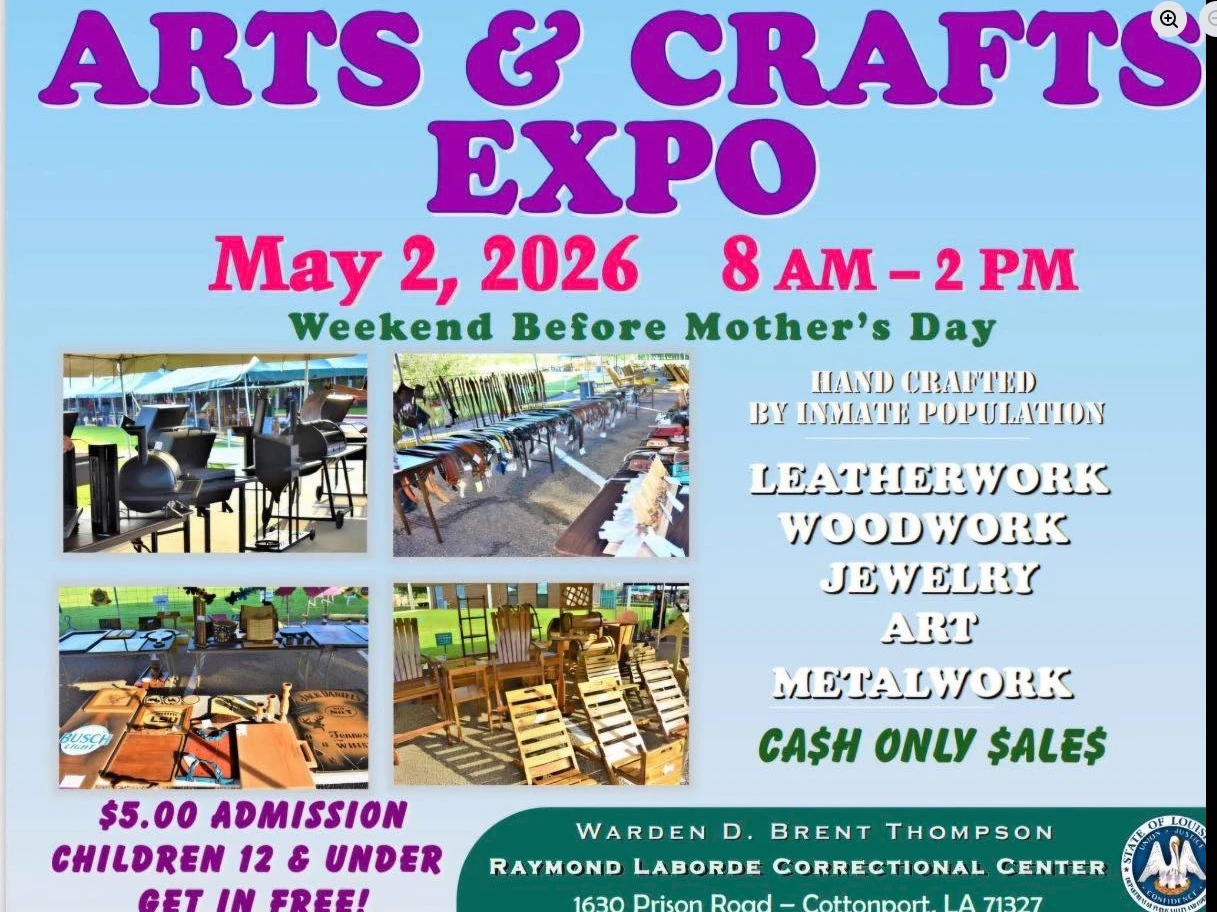 The Raymond Laborde Correctional Center will hold an Arts & Crafts expo on May 2nd from 8 am to 2 pm. Come out and shop for handcrafted items. And don't forget - Mother's Day is the following weekend! Admission is $5 and sales are cash only.