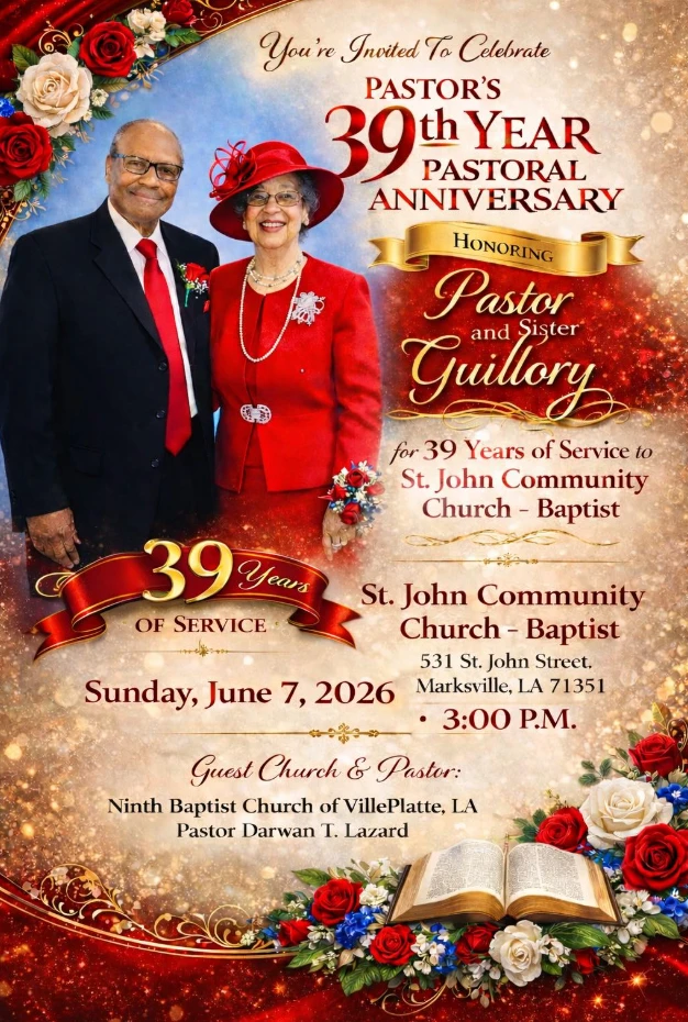You are invited to help celebrate Pastor and Sister Guillory's 39th pastoral anniversary at St. John's Community Baptist Church on June 7th starting at 3 pm.